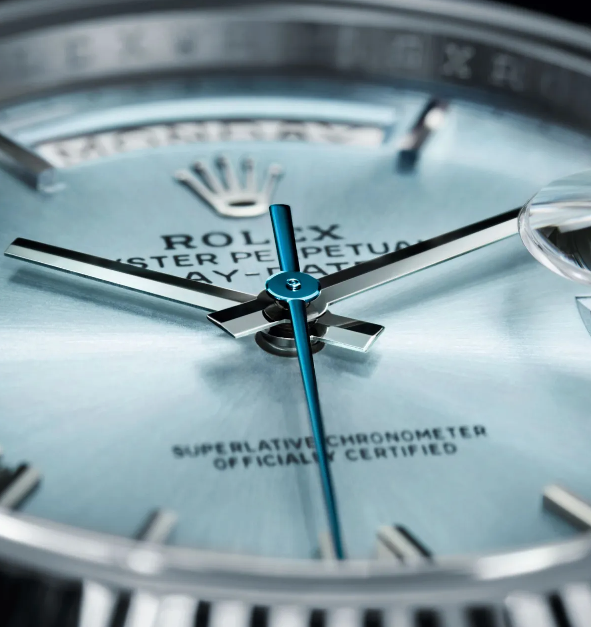 Crystal: Scratch-resistant sapphire with anti-reflective coating; Cyclops lens over the date with double anti-reflective coating